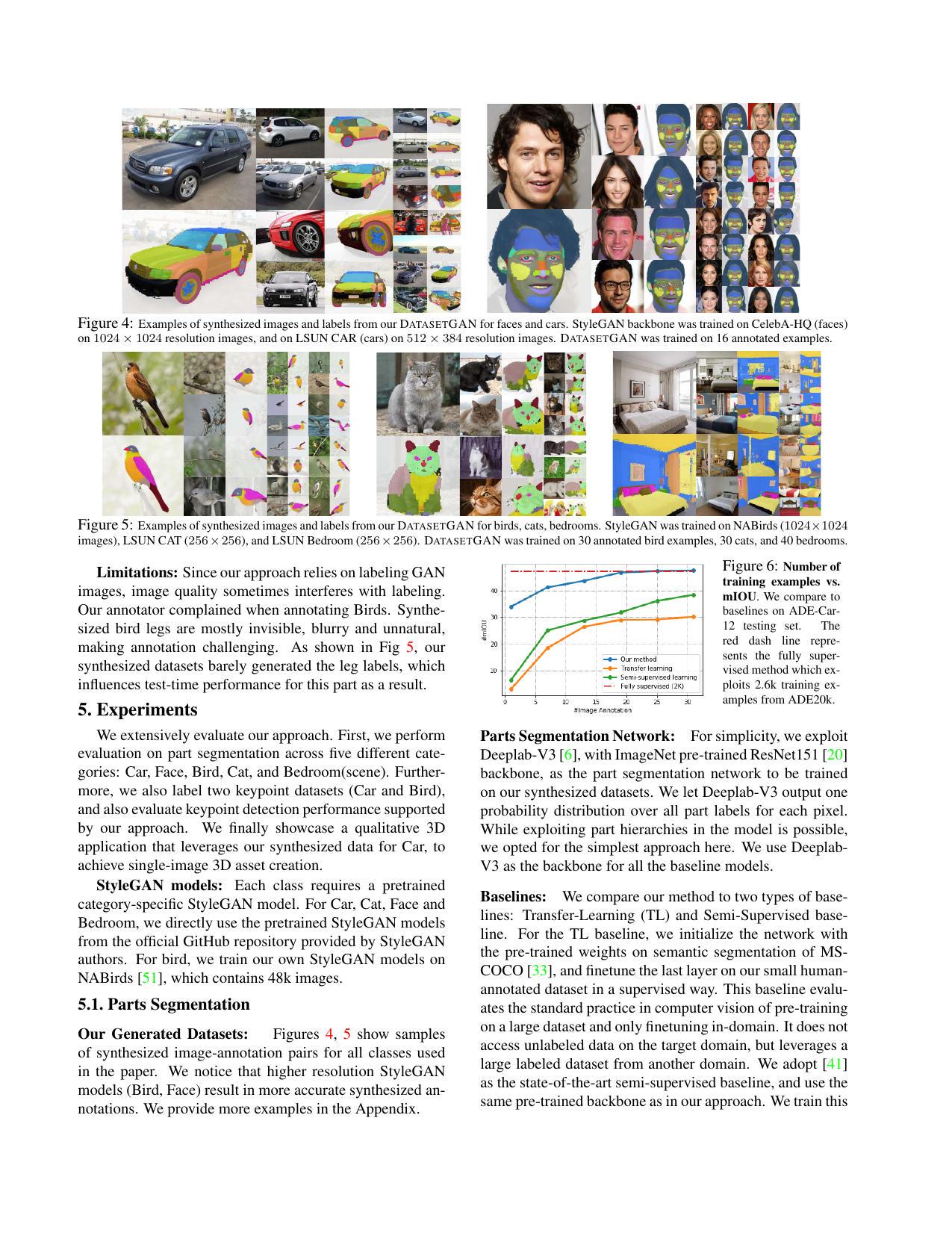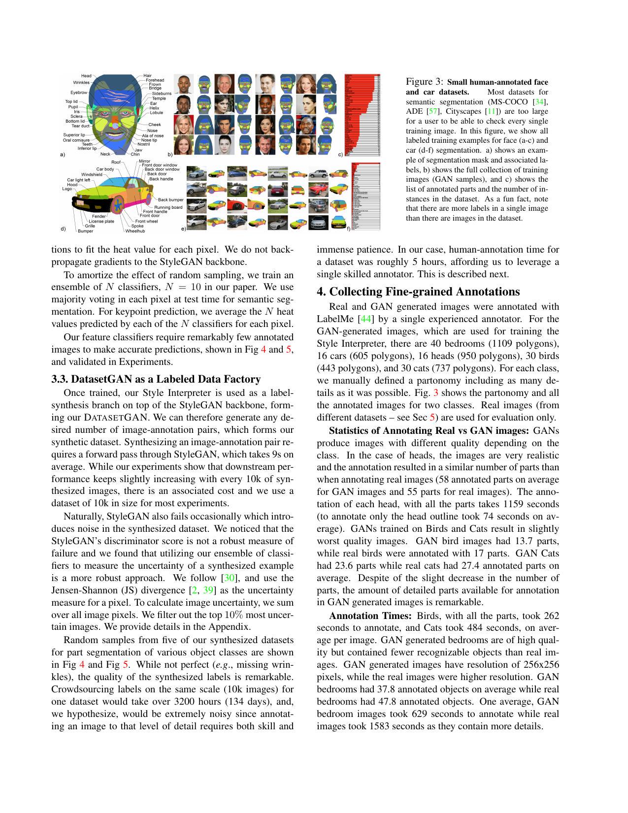 パートノミーは、各クラスに対して手動で定義され、可能な限り詳細に設定されました。頭部の場合、平均で58個のパーツがアノテーションされました。これらを手動でアノテーションしようとすると、1枚あたり約20分かかります。しかしながら、本手法のDatasetGANでは1枚あたり約9秒で済みます。