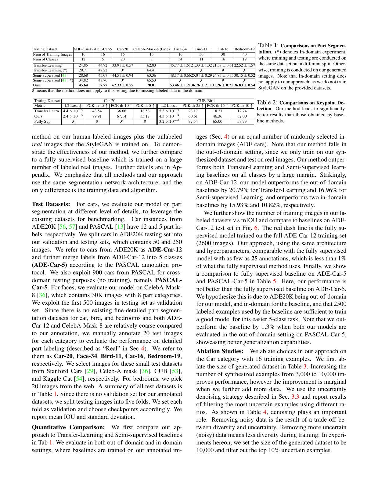 DatasetGANで合成した画像で学習すると、合成画像を使用しない一般的な転移学習や半教師あり学習のモデルよりも優れた性能を発揮することが示されました。加えて、いくつかのテストデータセットでは、DatasetGANで学習データ数を増やした場合に、完全教師あり学習と同等の性能を発揮することが明らかになりました。