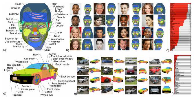 每个类别的伙伴都是手工定义的,并尽可能详细。在头部的情况下,平均有58个部分被注解。试图对这些部件进行手工注释,每件需要大约20分钟。然而,使用这种方法,DatasetGAN每件只需要大约9秒。