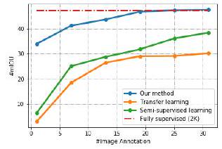 上图显示了使用名为ADE-Car12的汽车图像数据集的结果。横轴是用于训练的图像数量(以千计),纵轴是平均IOU。